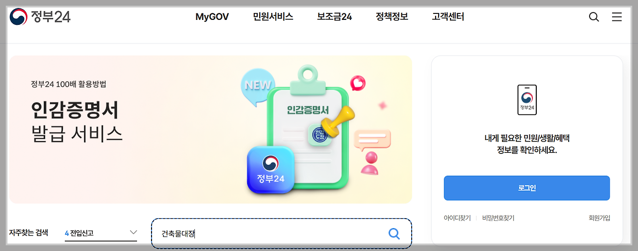 - 검색: 상단 검색창에 '건축물대장'을 입력하고, 관련 서비스를 선택합니다.