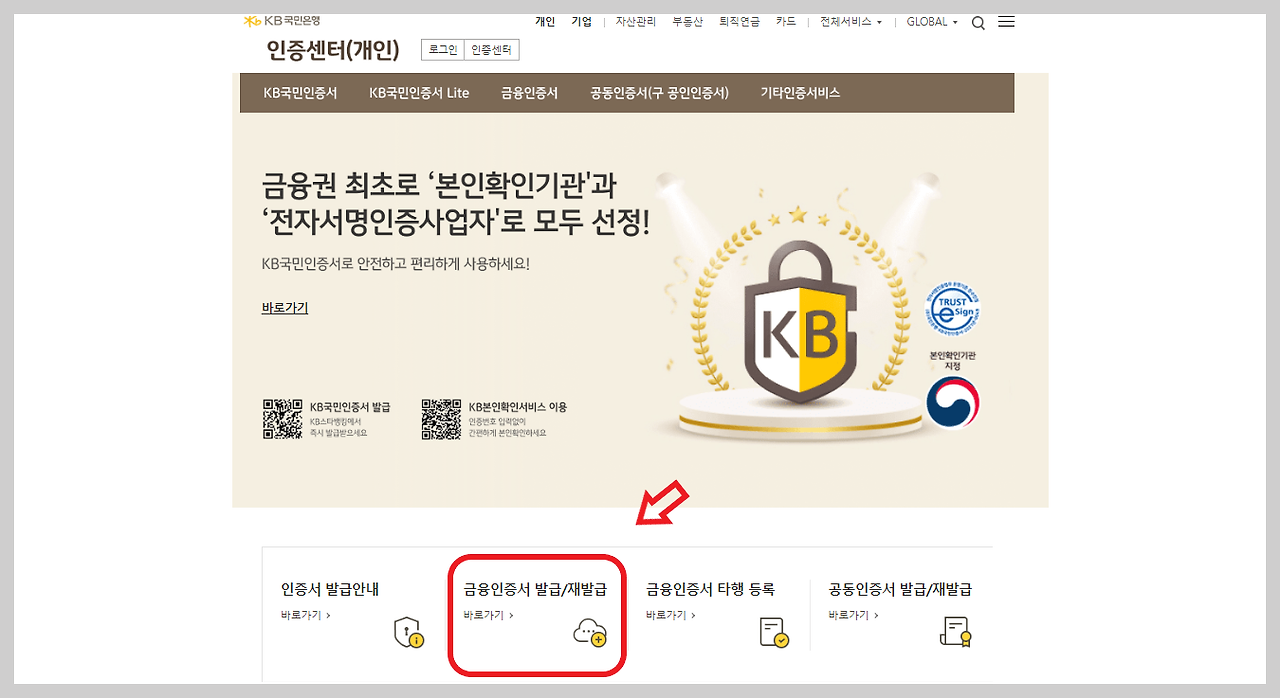 인증/보안 메뉴에서 ‘금융인증서 발급’을 클릭하세요.