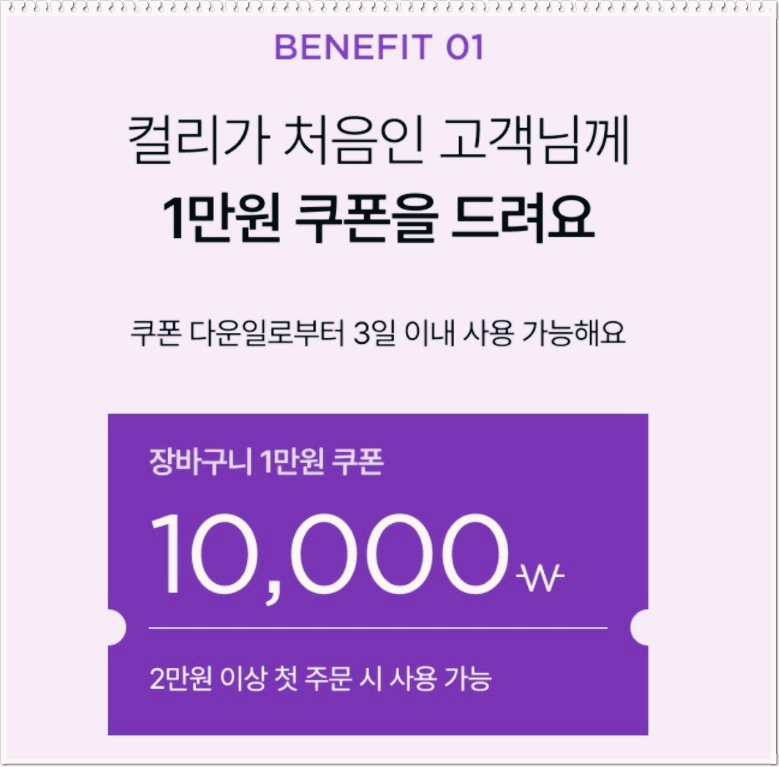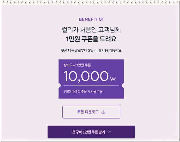 또한, 가입 후 웰컴 혜택으로 10,000원 할인 쿠폰도 제공되었어요. 이 쿠폰은 20,000원 이상 주문 시 사용할 수 있어, 실질적으로 큰 할인 효과를 누릴 수 있었습니다. 다양한 혜택이 있어 처음 이용하는 고객으로서 만족스러운 경험을 할 수 있었죠. 마켓컬리를 이용하기에 앞서 이러한 혜택을 잘 활용하면 보다 경제적으로 쇼핑할 수 있습니다.