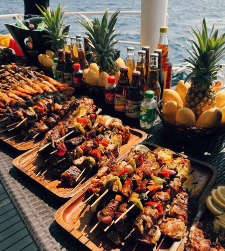 호핑투어에서 빼놓을 수 없는 즐거움 중 하나는 바로 식사 시간입니다. 골드 호핑투어에서는 점심으로 숯불 바베큐 플레터가 제공되며, 신선한 고기와 현지에서 재배한 과일들이 풍성하게 차려집니다. 바다 위에서 진행되는 식사는 특별한 낭만을 더해주며, 여유로운 분위기 속에서 세부의 아름다움을 만끽할 수 있는 기회를 제공합니다.