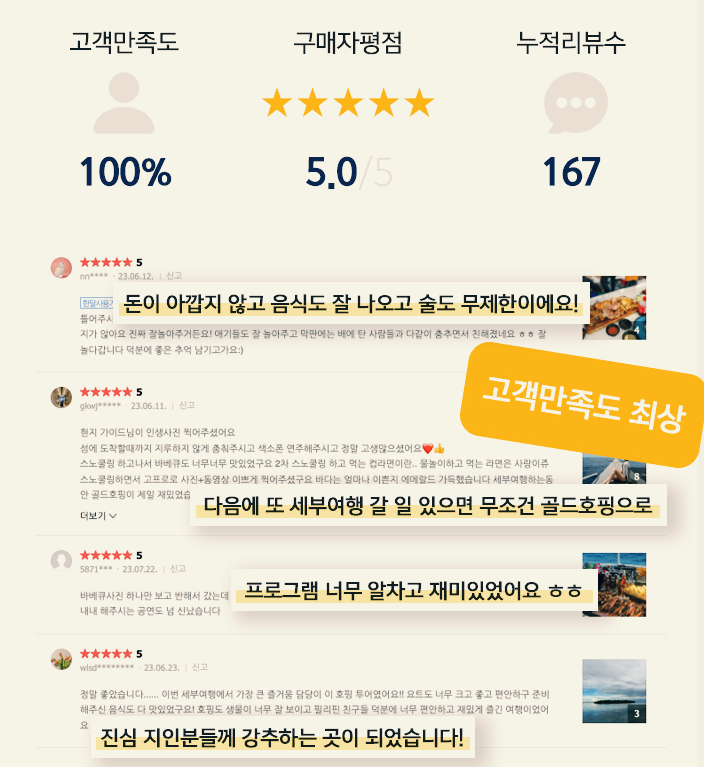 A8. 골드 호핑투어는 모든 액티비티에서 철저한 안전 관리를 실시합니다. 투어 시작 전 멀미약이 제공되며, 스노클링과 제트스키 등 물놀이를 할 때는 안전 요원이 항상 대기하고 있습니다. 각종 액티비티를 안전하게 즐길 수 있도록 사전 지침과 장비가 제공되며, 여행자들이 안심하고 투어를 즐길 수 있도록 세심한 배려가 이루어집니다.