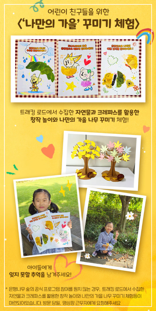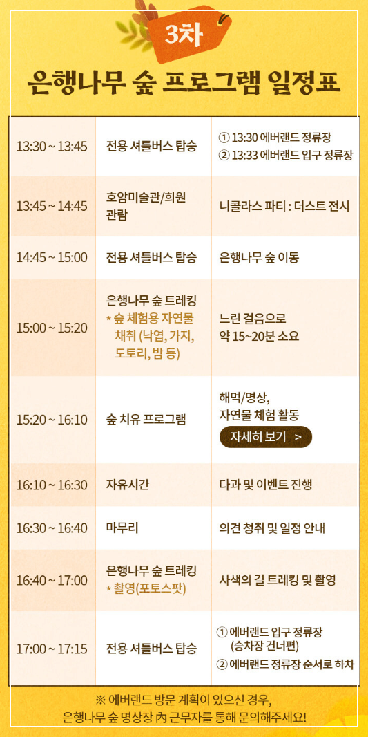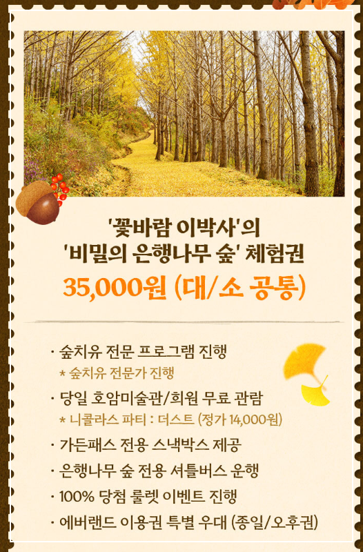 에버랜드의 비밀의 은행나무숲 체험 프로그램은 가을의 절경을 만끽하며 자연과 교감할 수 있는 특별한 기회를 제공합니다. 은행나무숲의 황금빛 풍경 속에서 트레킹을 즐기고, 전문가의 해설을 통해 자연에 대한 깊은 이해를 얻는 시간은 그 자체로 소중한 경험이 될 것입니다. 또한, 다양한 체험 활동과 예술 관람을 통해 힐링과 감성을 충족시킬 수 있는 이 프로그램은 가족과 친구와 함께하는 소중한 순간을 만들어줄 것입니다.