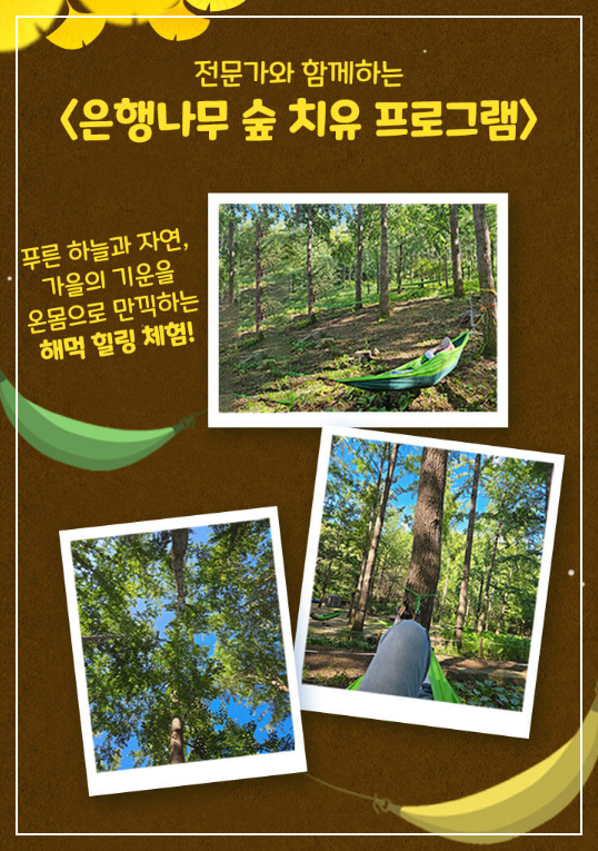 은행나무숲에서는 단순히 걷기만 하는 것이 아니라, 다양한 체험 활동을 통해 자연과 교감할 수 있습니다. 먼저 숲속에 마련된 해먹에 누워 명상하는 시간이 주어집니다. 해먹 명상을 통해 자연 속에서 몸과 마음을 치유하며, 스트레스를 풀고 정신적인 평화를 찾을 수 있습니다. 이 프로그램은 현대 사회에서 지친 마음을 달래고, 자연과의 연결을 다시금 느끼게 해줍니다.