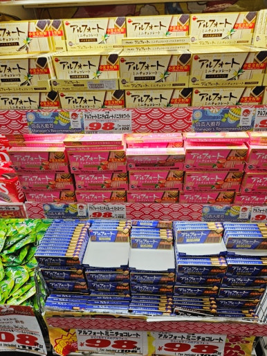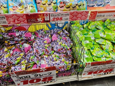 돈키호테에 들어서면 가장 먼저 눈에 띄는 것은 다양한 일본 과자들입니다. 특히, 모리나가의 베이크 크리미 치즈 쿠키는 진한 치즈 맛이 일품으로, 일본을 방문하면 꼭 한 번은 사봐야 할 제품입니다. 가격도 299엔으로 부담이 적어 여러 개 구매하기 좋습니다. 또한, 코로로젤리와 같은 재미있는 식감의 젤리도 있어, 여행의 즐거움을 더해줍니다. 이 외에도 피스타치오 초콜릿, 알포트 미니 초콜릿 등 다양한 초콜릿 제품들도 인기입니다.