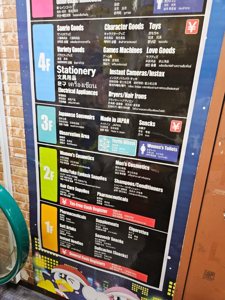 오사카 돈키호테 도톤보리점의 영업시간은 오전 9시부터 오전 4시까지입니다. 이곳은 6층으로 구성되어 있으며, 각 층마다 다양한 상품들이 준비되어 있습니다. 1층에서는 의약품, 라면, 간식 및 건강 보조식품을 찾을 수 있으며, 2층은 화장품과 헤어케어 용품으로 가득 차 있습니다. 3층에서는 기념품과 간식을, 4층에서는 산리오 상품과 캐릭터 상품을 만나볼 수 있습니다. 5층은 의류와 잡화, 향수, 렌즈 등을 판매하며, 6층에서는 고가 주류와 귀금속을 찾을 수 있습니다. 이처럼 다양한 상품들이 층별로 잘 정리되어 있어 쇼핑하기에 매우 편리합니다.