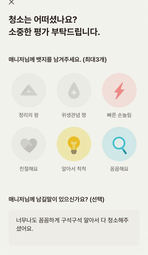 청소가 끝난 후에는 평가를 남길 수 있어, 담당자의 배정에 도움이 됩니다. 청소 서비스가 끝난 후에는 세심하게 평가를 남길 수 있으며, 이를 통해 다음 청소 시 더 나은 서비스를 받을 수 있습니다. 저의 경우, 고양이를 키우고 있어 청소 시 주의가 필요한 부분이 많았는데, 미리 전달한 사항 덕분에 청소도 더욱 꼼꼼하게 진행되었습니다.