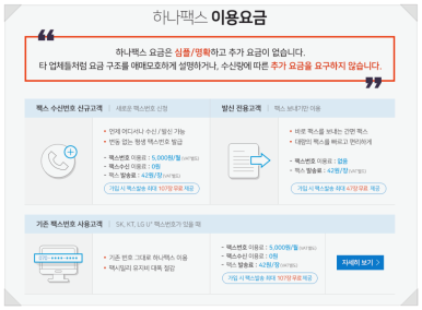 하나팩스의 요금 체계는 매우 합리적입니다. 수신할 때는 무료이며, 발송 요금은 한 장당 42원으로 매우 저렴합니다. 개인 번호를 사용할 경우 월 5천원의 요금이 부과되지만, 가입 시 최대 47장까지 무료로 제공되는 혜택이 있어 충분히 사용해 볼 수 있습니다. 이 외에도 서비스가 마음에 들지 않을 경우 가입 후 1년 이내에 전액 환불이 가능하다는 점도 신뢰할 수 있는 요소입니다.