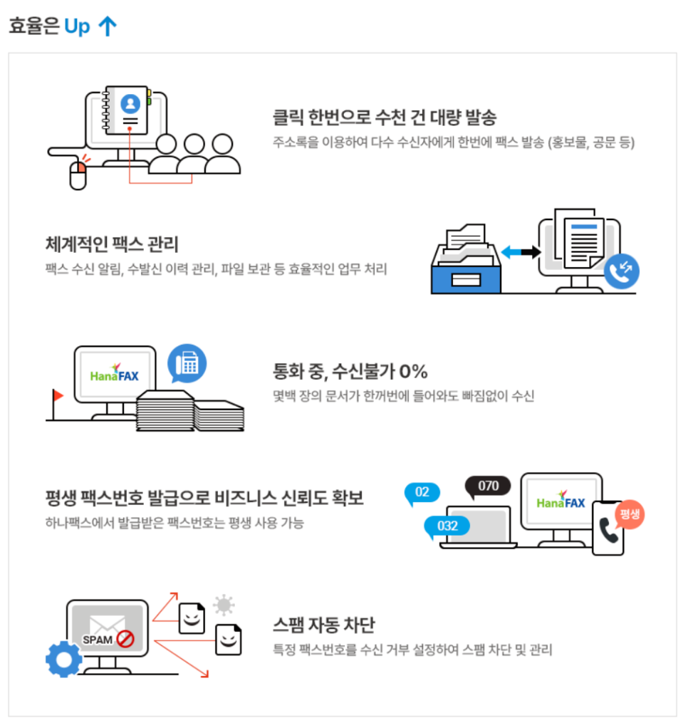 하나팩스는 인터넷 기반의 서비스로, 스마트폰만 있으면 언제 어디서나 간편하게 문서를 주고받을 수 있습니다. 이 서비스의 가장 큰 장점 중 하나는 수신 확인 및 알람 기능을 통해 스팸 팩스를 쉽게 걸러낼 수 있다는 점입니다. 전송 결과와 수발신 이력을 스마트폰의 전화 목록처럼 쉽게 관리할 수 있어, 번거로운 종이 문서 관리에서 벗어날 수 있습니다. 수신된 문서는 영구적으로 깨끗한 상태로 보관할 수 있어, 분실 걱정 없이 안전하게 관리할 수 있습니다. 이 모든 기능은 여러분의 업무 환경을 더욱 쾌적하게 만들어 줄 것입니다.