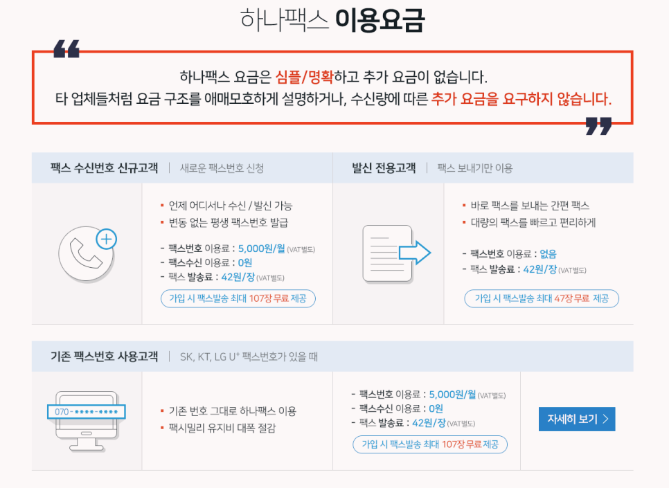 하나팩스의 요금 체계는 매우 합리적입니다. 팩스 수신은 무료이며, 발송 요금은 한 장당 42원으로 설정되어 있습니다. 개인 팩스 번호를 사용할 경우 월 5천원의 요금이 부과되는데, 가입 시에는 최대 47장까지 무료로 제공됩니다. 이러한 점은 사용자가 부담 없이 서비스를 체험해 볼 수 있는 큰 장점입니다.