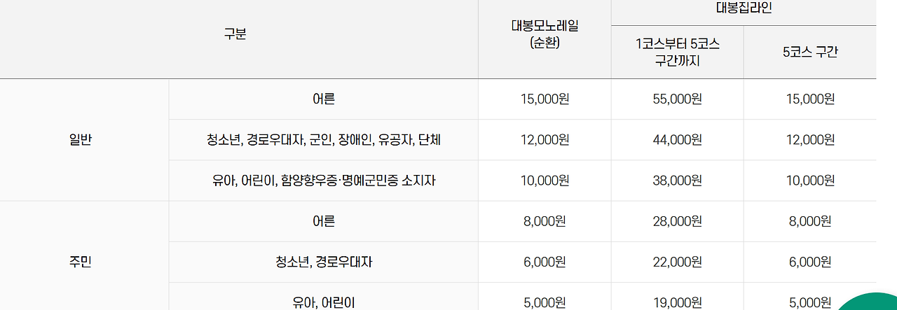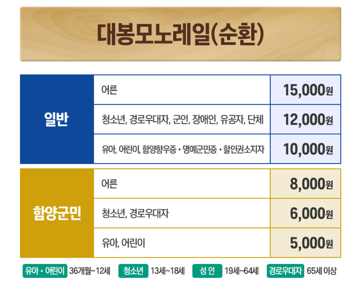대봉산 모노레일의 요금은 어른 15,000원, 청소년 12,000원, 어린이 10,000원입니다. 단체 예약 시 할인 혜택이 있으니 가족이나 친구들과 함께 방문할 경우 단체 예약을 고려해보세요. 요금은 현장에서 결제할 수 있으며, 사전 예약 시에도 동일한 요금이 적용됩니다.