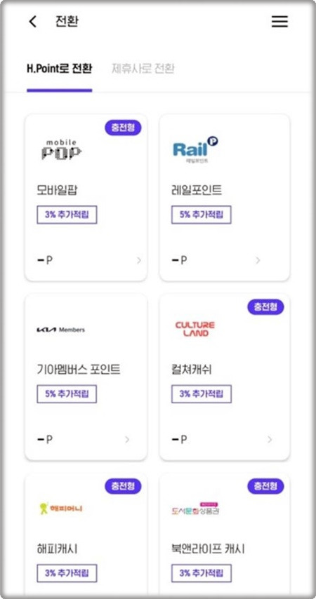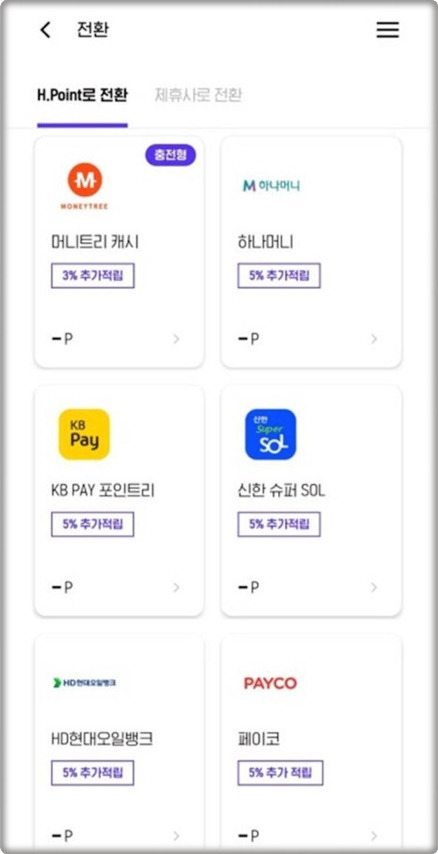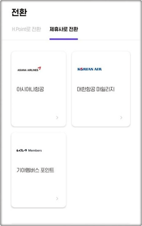 H포인트는 다른 제휴 포인트 시스템과의 전환이 가능하여, 고객은 다양한 서비스에서 적립된 포인트를 H포인트로 전환하거나 반대로 전환할 수 있는 옵션을 제공합니다. 예를 들어, 모바일팝, 레일포인트, 기아멤버스, 컬처캐쉬와 같은 다양한 제휴사에서 포인트를 전환할 수 있습니다. 이로 인해 고객은 구매 시 할인을 받는 것과 같은 효과를 누릴 수 있습니다.